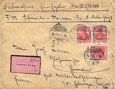 Inlandsbrief mit Nachnahme (21-250 g) vom 26.07.1905 frankiert mit 3 Marken a 10 Pfennig (=30 Pfennig, 20 Brief 10 Nachnahme) |