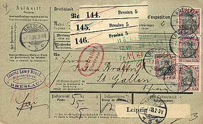 Auslandspaketkarte (3 x 5 000 g) vom 07.07.1906 frankiert mit 6 Marken a 40 Pfennig (=2,40 Mark) |