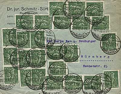 Inland cover (1-20 g) from 22.12.1922 (11. Period) franked with 25 stamps a 100 Pfennig (=25 Mark) |