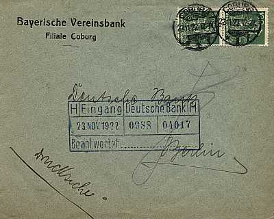 Local cover (1-20 g) from 02.10.1922 (9. Period) franked with 2 stamps a 100 Pfennig (=2 Mark) |