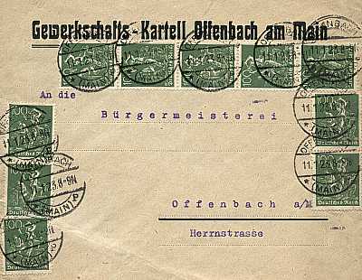 Local cover (1-20 g) from 11.01.1923 (11. Period) franked with 10 stamps a 100 Pfennig (=10 Mark) |