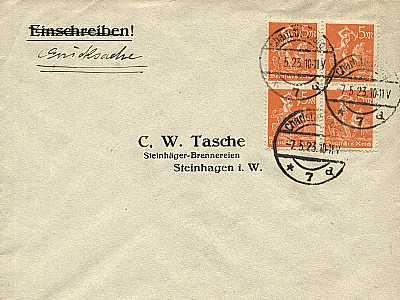 Inlandsdrucksache (1-25 g) vom 07.05.1923 (13. Periode) frankiert mit 4 Marken a 5 Mark (=20 Mark)