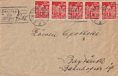 Inland printed matter (1-25 g) from 30.07.1923 (14. Period) franked with 5 stamps a 12 Mark (=60 Mark)