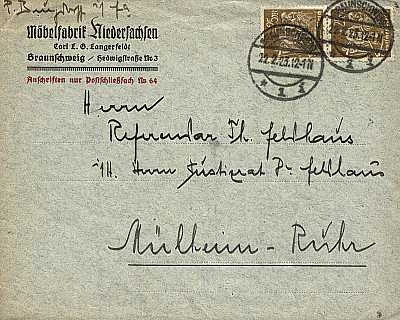 Inlandsbrief (1-20 g) vom 22.02.1923 (12. Periode) frankiert mit 2 Marken a 25 Mark (=50 Mark) |