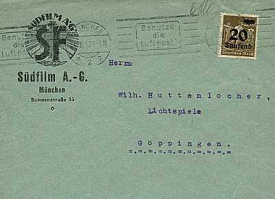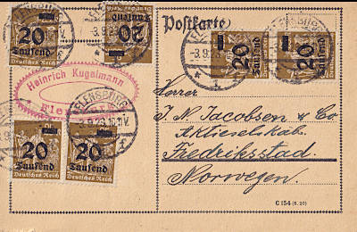 Inland cover (1-20 g) from 24.08.1923 (16. Period) franked with one stamp a 20 000 Mark on 25 Mark (=20 000 Mark) |