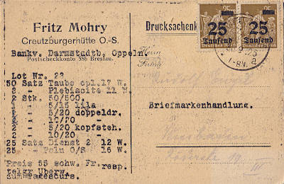 Inland printed matter (1-25 g) from 30.09.1923 (18. Period) franked with 2 stamps a 25 000 Mark on 25 Mark(=50 000 Mark)