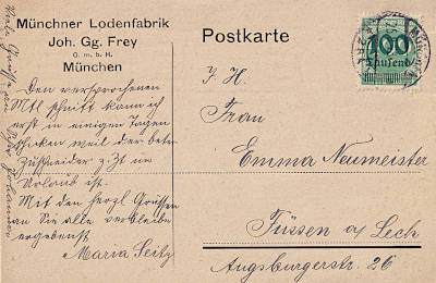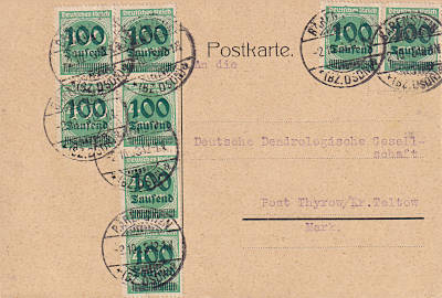 Inland postcard from 25.09.1923 (18. Period) franked with one stamp a 100 000 Mark on 400 Mark (=100 000 Mark) |