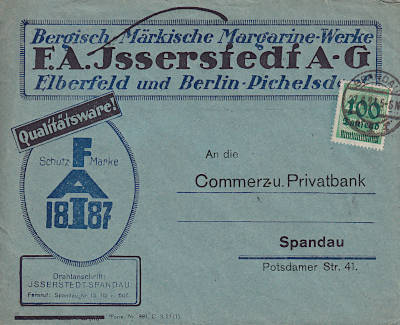 Local cover (1-20 g) from 27.09.1923 (18. Period) franked with one stamp a 100 000 Mark on 400 Mark (=100 000 Mark) |