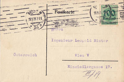Foreign postcard from 28.09.1923 (18. Period) franked with one stamp a 100 000 Mark on 400 Mark (=100 000 Mark); to Austria the inland fee was valid |