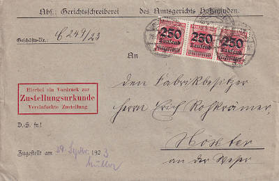 Inland cover with affidavit of service (1-20 g) from 29.09.1923 (18. Period) franked with 3 stamps a 250 000 Mark on 500 Mark (=750 000 Mark, 250 000 cover 250 000 delivery 250 000 document) |