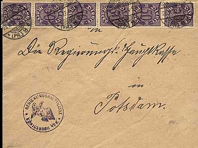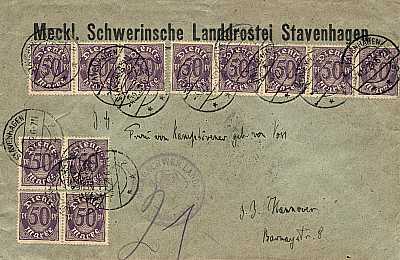 Inland cover (1-20 g) from 19.06.1922 (7. Period) franked with 4 stamps a 50 Pfennig (=2 Mark) |