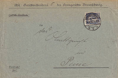 Local cover with affidavit of service (1-20 g) from 08.04.1922 (7. Period) franked with 2 stamps a 2 Mark (=4 Mark, 1,25 cover 1,50 delivery 1,25 document) |