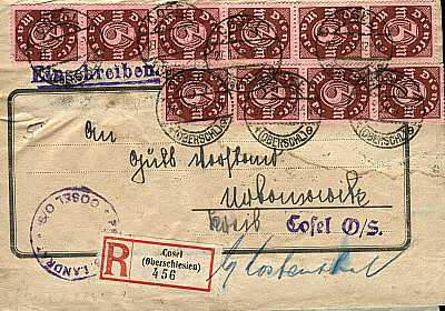 Inland cover with registeration (1-20 g) from 27.01.1923 (12. Period) franked with 30 stamps a 3 Mark (=90 Mark, 50 cover 40 registeration)