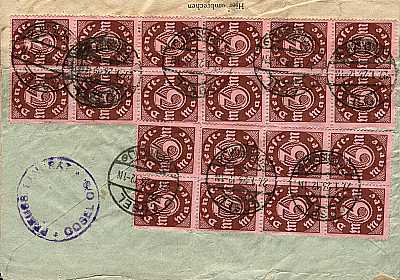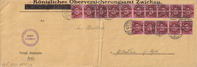 Inland cover (101-250 g) from 15.12.1923 (11. Period) franked with 15 stamps a 3 Mark(=45 Mark)