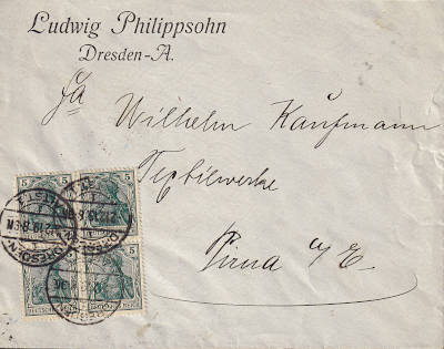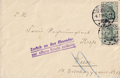 Foreign cover (1-20 g) from 06.07.1916 (1. Period) franked with 2 stamps a 5 Pfennig (=10 Pfennig); to Austria the inland fee was valid |