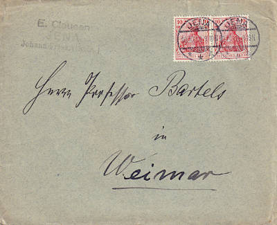 Inlandsbrief (1-20 g) vom 30.01.1920 (4. Periode) frankiert mit 2 Marken a 10 Pfennig (=20 Pfennig) |