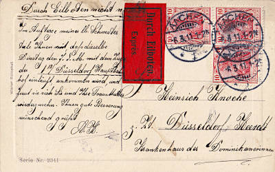 Inlandspostkarte mit Eilzustellung vom 06.03.1911 (1. Periode) frankiert mit 3 Marken a 10 Pfennig (=30 Pfennig, 5 Postkarte 25 Eilzustellung) |