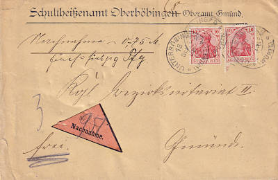 Inlandsbrief mit Nachnahme (1-20 g) vom 18.09.1915 (1. Periode) frankiert mit 2 Marken a 10 Pfennig (=20 Pfennig, 10 Brief 10 Nachnahme) |