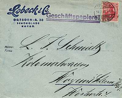 Inlandsbrief (21-250 g) vom 10.10.1910 (1. Periode) frankiert mit 2 Marken a 10 Pfennig (=20 Pfennig) |