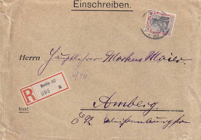 Foreign cover with registeration (1-20 g) from 27.12.1918 (3. Period) franked with one stamp a 40 Pfennig (=40 Pfennig, 20 cover 20 registeration) |
