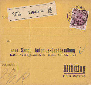 Inland parcel card (2 500 g, > 75 km) from 21.06.1918 (2. Period) franked with one stamp a 60 Pfennig (=60 Pfennig) |