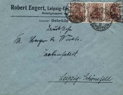 Foreign printed matter (1-50 g) from 01.11.1920 (5. Period) franked with 4 stamps a 5 Pfennig (=20 Pfennig)