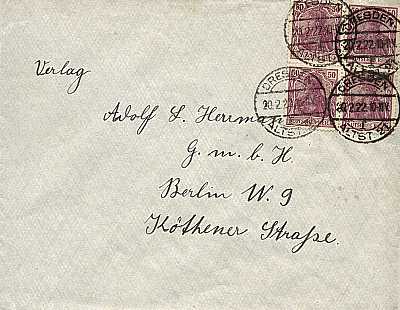 Inland cover (1-20 g) from 20.02.1922 (7. Period) franked with 4 stamps a 50 Pfennig (=2 Mark)