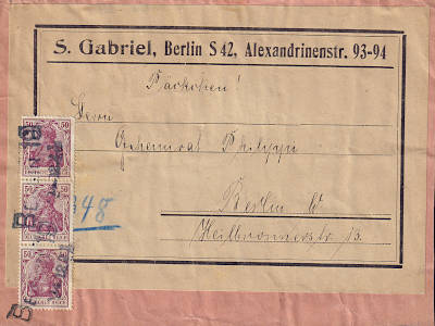 Inland small parcel (1-1 000 g) from 14.12.1921 (6. Period) franked with 3 stamps a 50 Pfennig (=1,50 Mark)