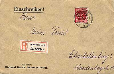 Inlandsbrief mit Einschreiben (21-100 g) vom 15.06.1923 (13. Periode) frankiert mit einer Marke a 200 Mark (=200 Mark, 120 Brief 80 Einschreiben) |