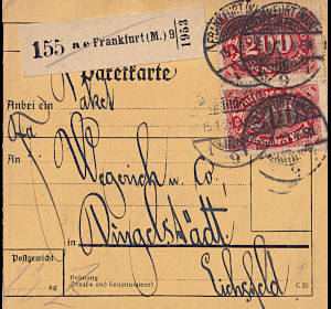 Inlandspaketkarte (2 500 g, > 75 km) vom 15.01.1923 (12. Periode) frankiert mit 2 Marken a 200 Mark (=400 Mark) |