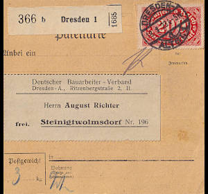 Inlandspaketkarte (3 000 g, < 75 km) vom 18.01.1923 (12. Periode) frankiert mit einer Marke a 200 Mark (=200 Mark) |