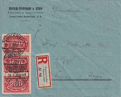 Inlandsbrief mit Einschreiben (1-20 g) vom 27.07.1923 (14. Periode) frankiert mit 2 Marken a 200 Mark (=600 Mark, 300 Brief 300 Einschreiben) |