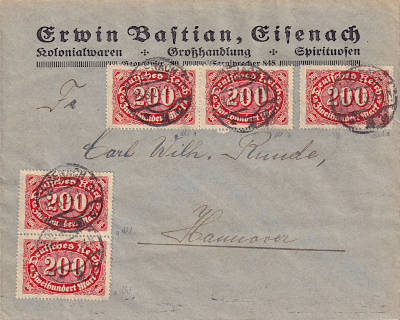 Auslandsbrief (1-20 g) vom 03.07.1923 (14. Periode) frankiert mit 4 Marken a 200 Mark (=800 Mark) |