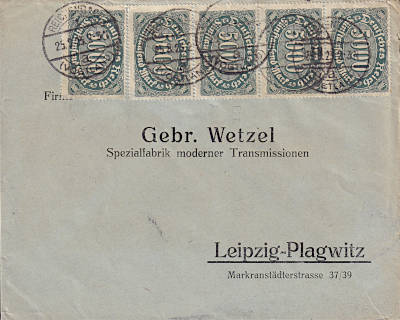 Inland cover (21-100 g) from 25.08.1923 (16. Period) franked with 5 stamps a 5 000 Mark (=25 000 Mark) |