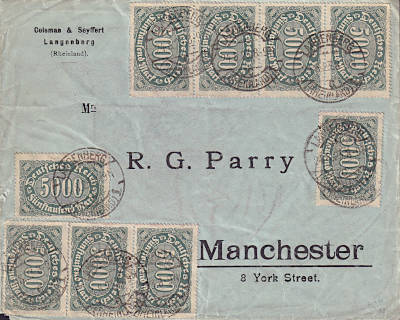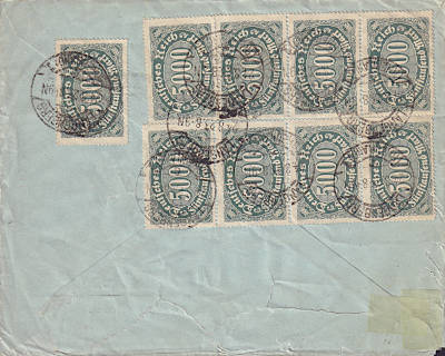 Inland cover with registeration (1-20 g) from 25.08.1923 (16. Period) franked with 8 stamps a 5 000 Mark (=40 000 Mark, 20 000 cover 20 000 registeration) |