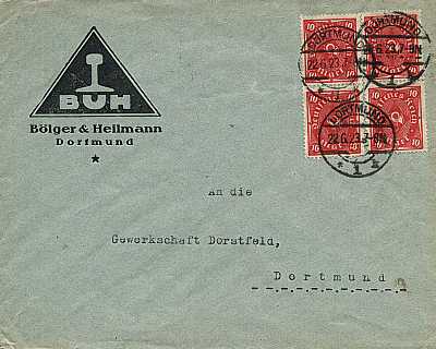 Local cover (1-20 g) from 22.06.1923 (13. Period) franked with 4 stamps a 10 Mark (=40 Mark) |