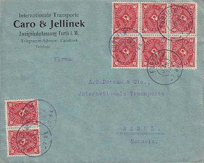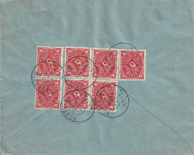 Foreign cover with registeration (1-20 g) from 16.10.1922 (9. Period) franked with one stamp a 10 Mark (=10 Mark, 6 cover 4 registeration); to Austria the inland fee was valid |