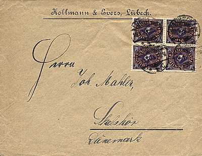 Foreign cover (1-20 g) from 10.01.1923 (11. Period) franked with 4 stamps a 20 Mark (=80 Mark) |
