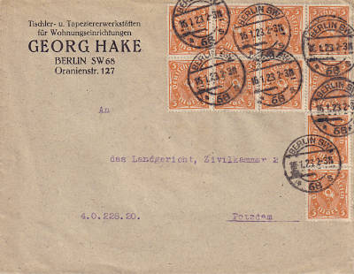 Inland book order (1-25 g) from 17.06.1923 (13. Period) franked with 4 stamps a 5 Mark (=20 Mark) |