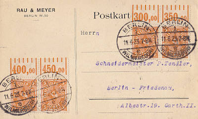 Local postcard from 11.06.1923 (13. Period) franked with 4 stamps a 5 Mark (=20 Mark) |