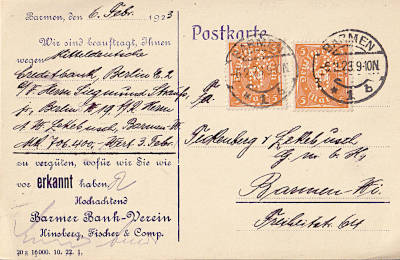 Local postcard from 06.02.1923 (12. Period) franked with 2 stamps a 5 Mark (=10 Mark) |