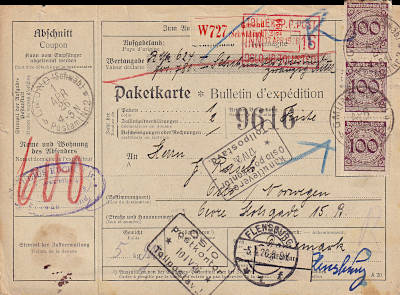 Auslandspaketkarte mit Wertangabe (624 Mark) (5 900 g) vom 01.04.1926 (27. Periode) frankiert mit 6 Marken a 100 Pfennig (=6 Mark)