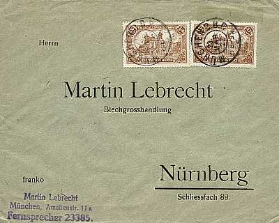 Inland cover (21-100 g) from 23.03.1922 (7. Period) franked with 2 stamps a 1,50 Mark (=3 Mark) |