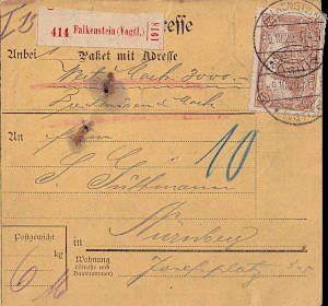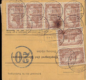 Foreign parcel card (4 000 g) from 05.05.1920 (4. Period) franked with 8 stamps a 1,50 Mark (=12 Mark) |