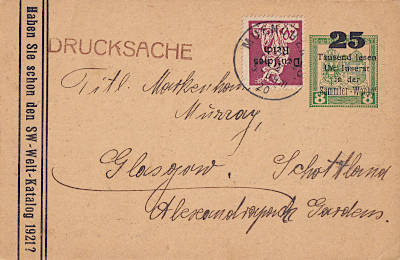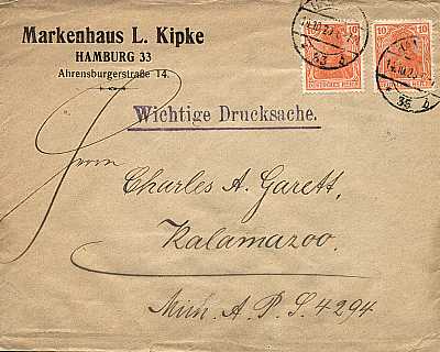 Foreign printed matter (1-50 g) from 14.10.1920 franked with 2 stamps a 10 Pfennig (=20 Pfennig)