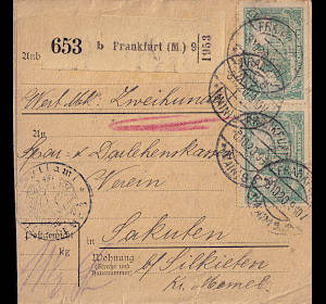 Foreign parcel card with value (200 Mark) (11 500 g, > 75 km) from 08.10.1920 franked with 8 stamps (=9,50 Mark, 8 parcel 0,50 registeration 1 value) |