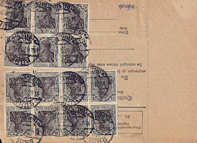 Foreign parcel card (5 000 g) from 10.06.1920 franked with 16 stamps a 75 Pfennig(=12 Mark)