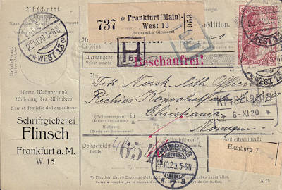 Foreign parcel card (4 500 g) from 22.10.1920 franked with 6 stamps (=14 Mark)