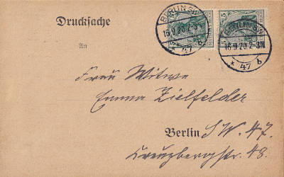 Inlandsdrucksache (1-50 g) vom 16.09.1920 frankiert mit 2 Marken a 5 Pfennig (=10 Pfennig) |