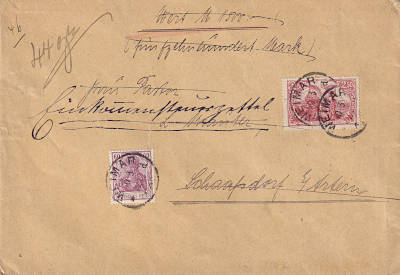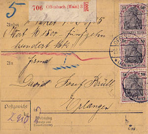 Inlandspaketkarte mit Wertangabe (1 500 Mark) (2 910 g, > 75 km) vom 25.11.1920 frankiert mit 13 Marken a 50 Pfennig (=6,50 Mark, 2 Paket 0,50 Einschreiben 4 Wert) |